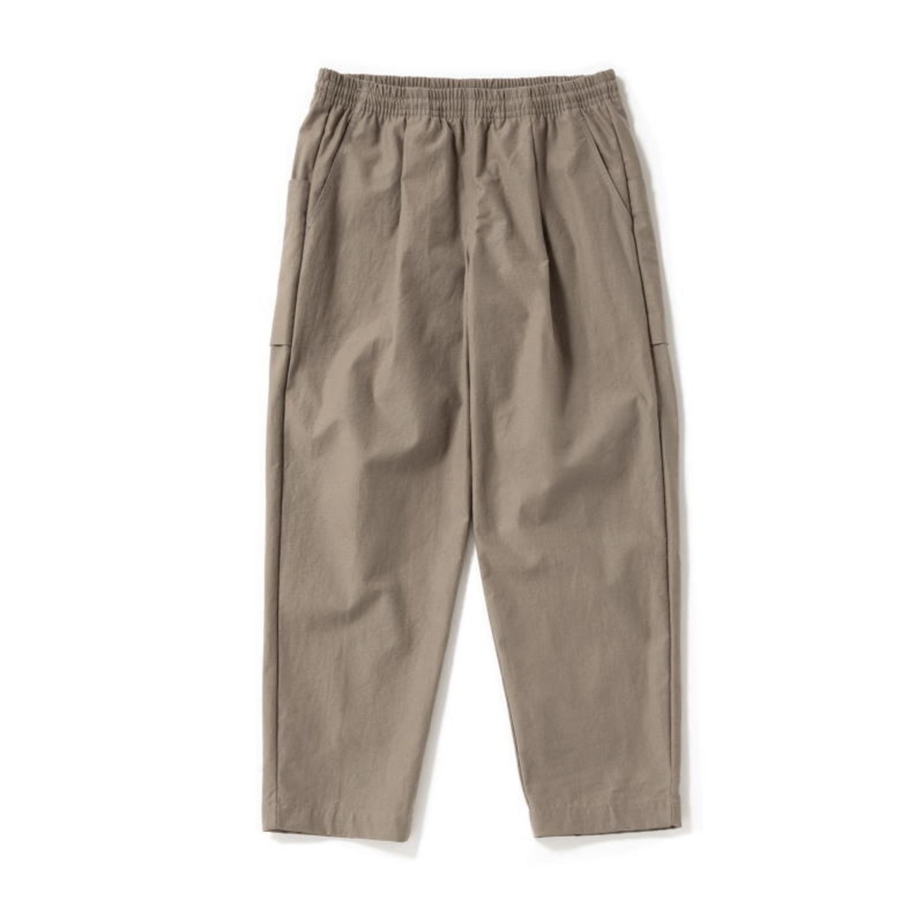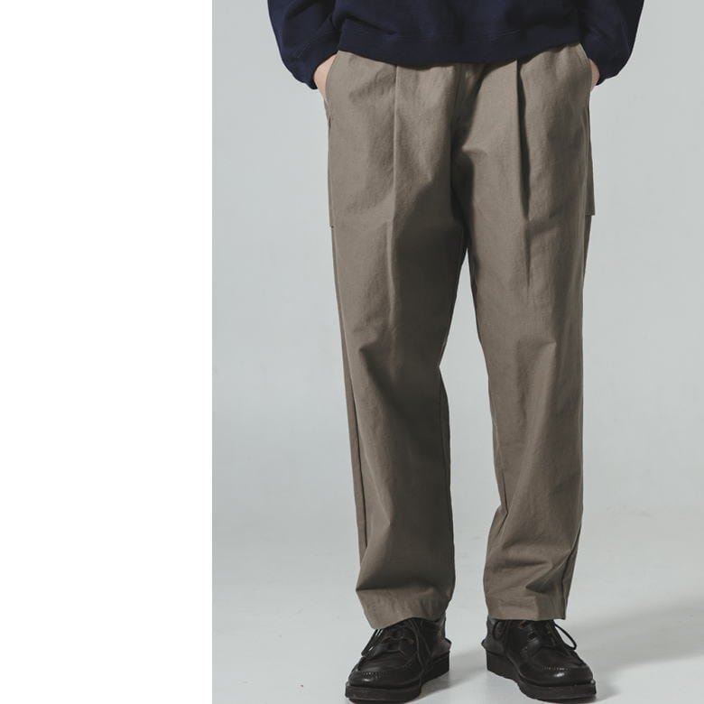 腰回りはゆったりとしながらも裾にかけて強めのテーパーですっきり見える設計です。ウエストはゴムとコードで調節が可能です。