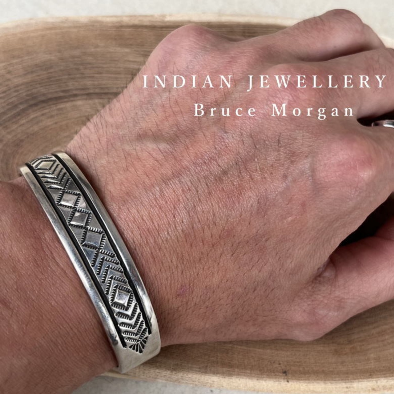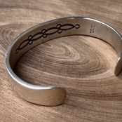 ナバホ族・ブルースモーガンの太めスタンプワークバングルです。伝統技法のスタンプを刻印した雰囲気抜群の一本。