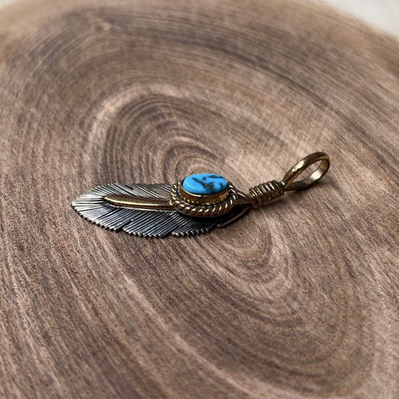 イーグルフェザーにターコイズをひと粒、12KGFのワイヤーと共にあしらった存在感のある1点。