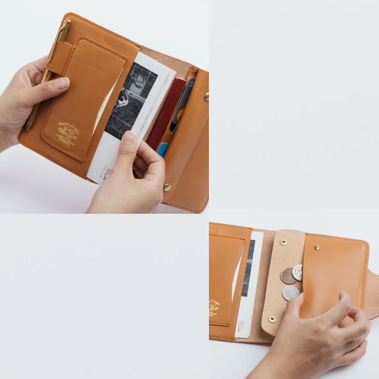 A6サイズのノートを挟むことができ、細かく仕切られたポケットにはカードや小さな紙類を整理して収納できます。