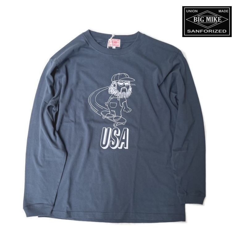 BIG MIKEの25秋冬新作、USAスケートオジサン長袖Tシャツは、ユニークなデザインが特徴です。スケートボードに乗ったおじさんのイラストがフロントに描かれ、サングラスをかけた姿が印象的です。