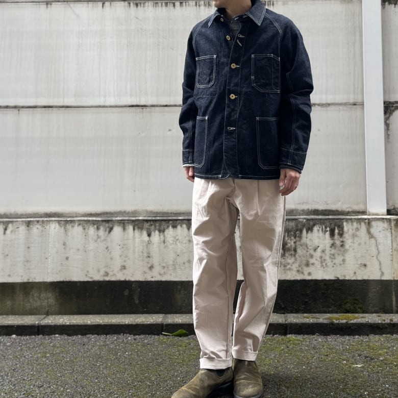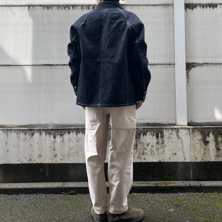 釦はゴールドのタック釦を打ち込み、ワークウェアでありながら、どこか気品のあるジャケットに仕上げた。