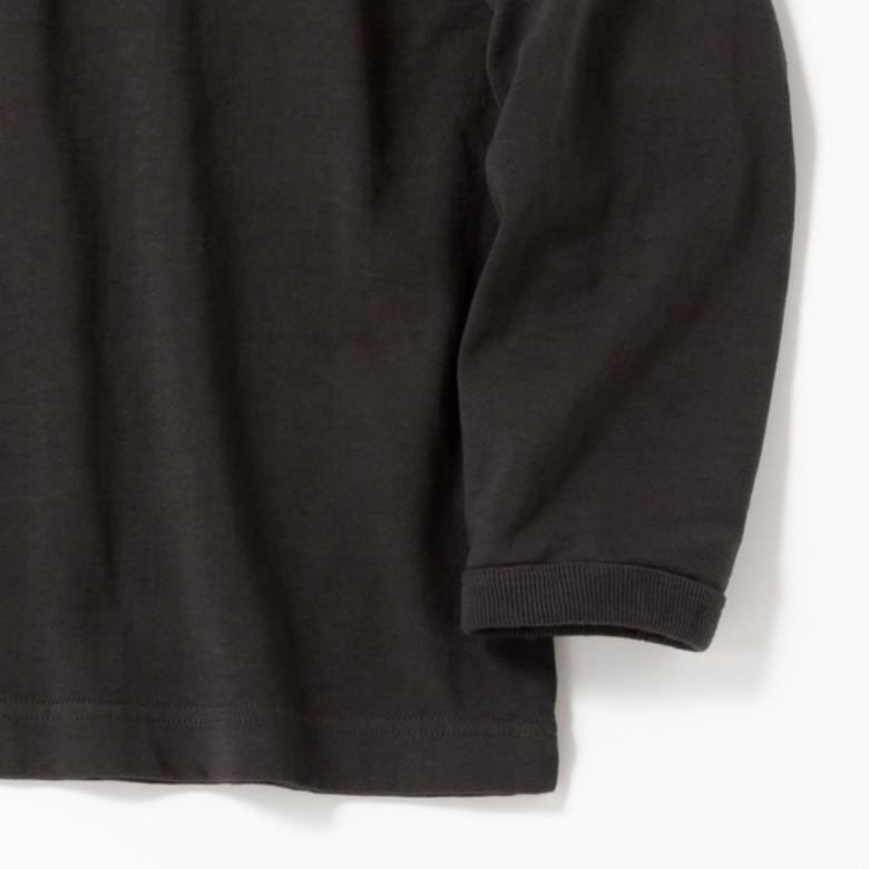 身生地に合わせスウエット並みのしっかりした厚みのリブを使用し全体のバランスを整えたこの長袖Tシャツはハリ感もあるので肌へのまとわりつきも少なく春先から着用できます。