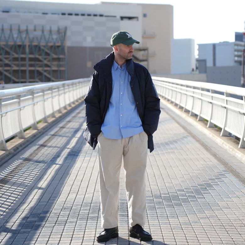 都会で着るダウンジャケットをイメージした新作のコラボアイテムです。 縦糸にPE/NYLONの割繊糸40d 緯糸にNYLON70dを使用した高密度素材。