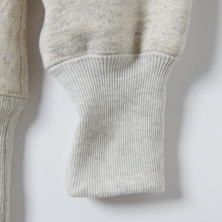 「REVERSE WEAVE」は、アメリカの老舗紳士服店ヒッキーフリーマンでカッターとして働いていた経験を持つ営業マンのサム・フリードランドが顧客から「洗濯による縮み」を指摘され、それを解決するため試行錯誤の末に考案した製法です。本来は縦方向に使われる生地を横方向に使用し、縮みを軽減することに成功しました。この復刻商品では、肩に縫い目のない一枚布で作ったシームレスショルダーや、筒状のスウェットからパターンを起こす当時の製法を忠実に再現。