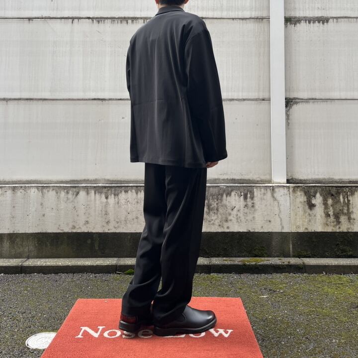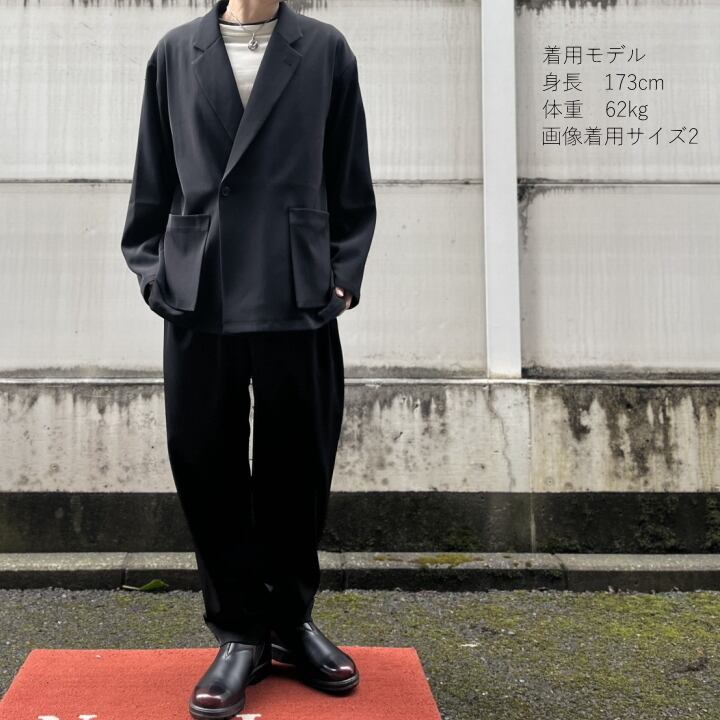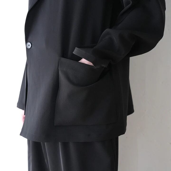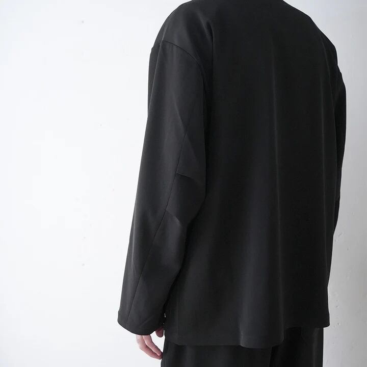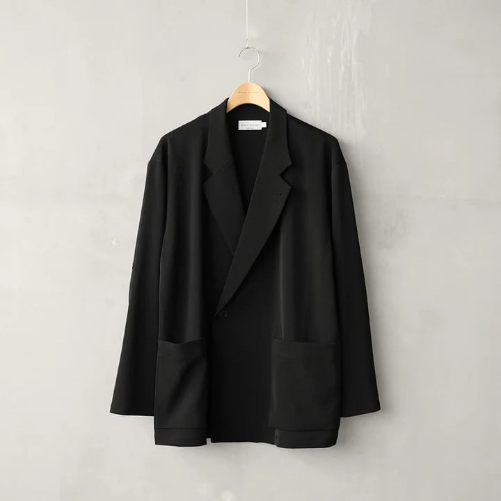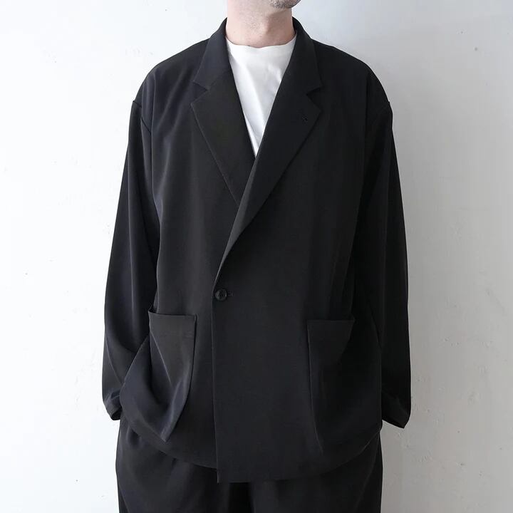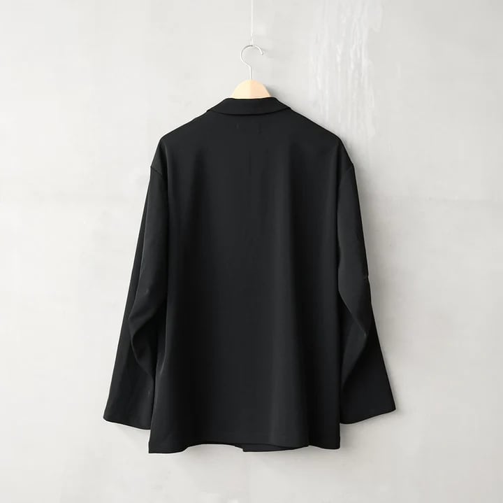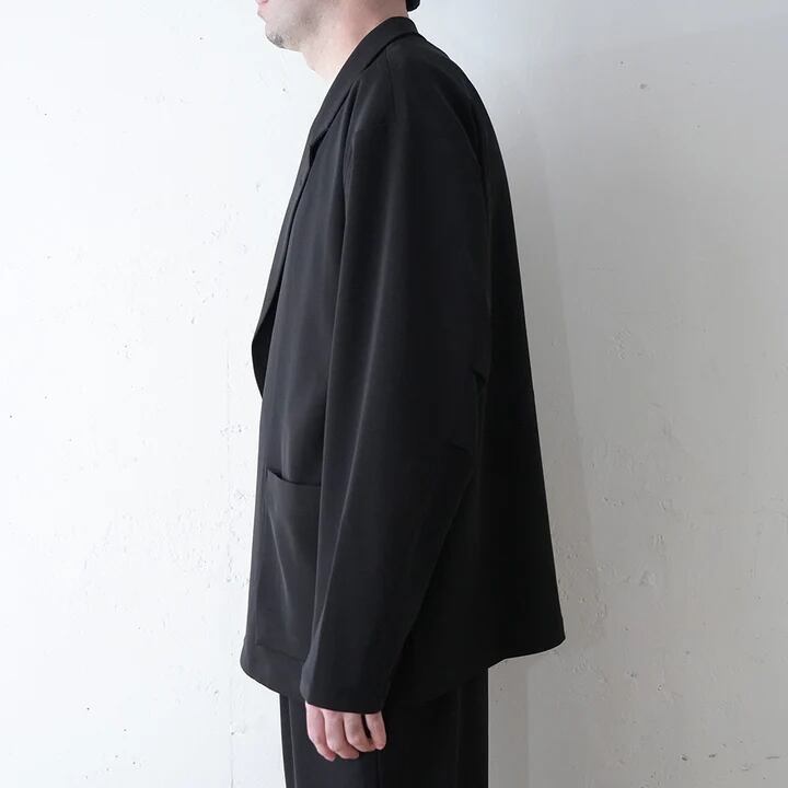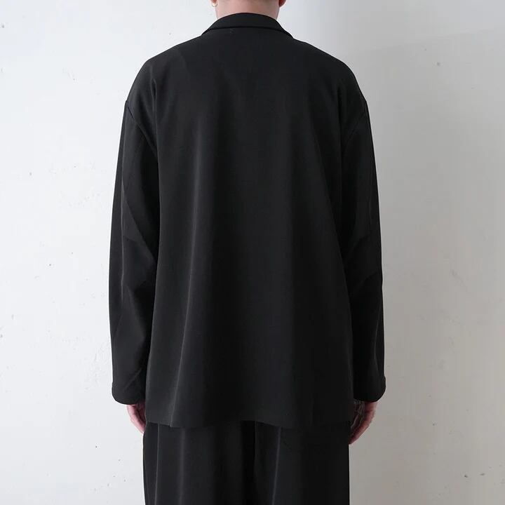 ポリエステルの強撚糸ならではの接触冷感性と軽い生地感が特徴のツイルを使用したオーバーサイズのダブルジャケット。