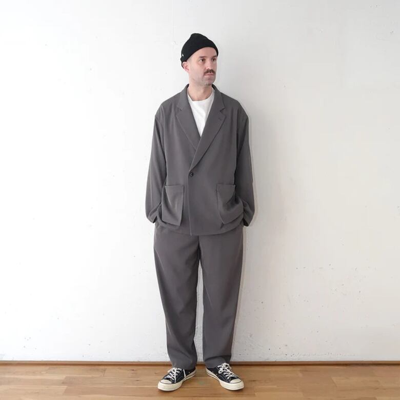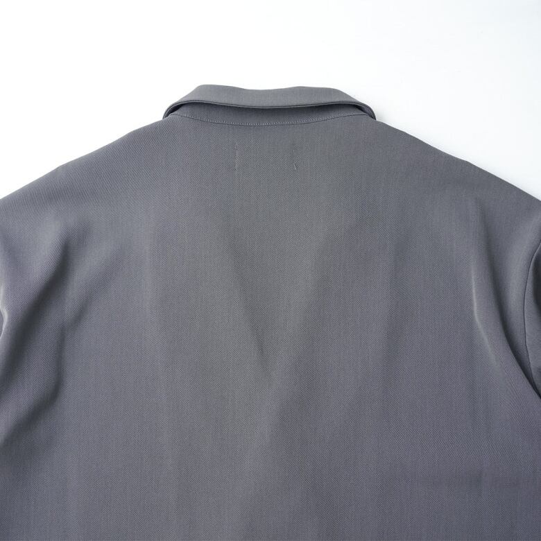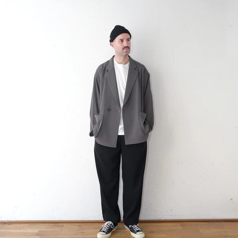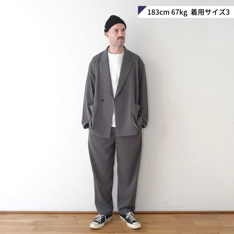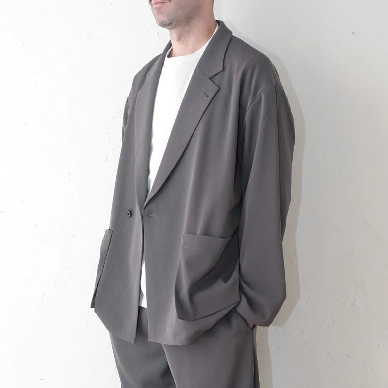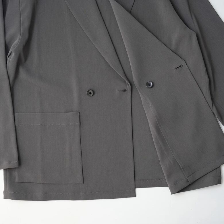ポリエステルの強撚糸ならではの接触冷感性と軽い生地感が特徴のツイルを使用したオーバーサイズのダブルジャケット。