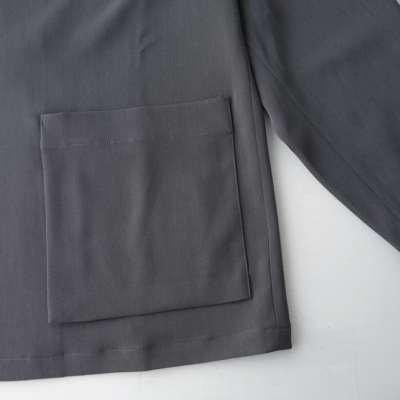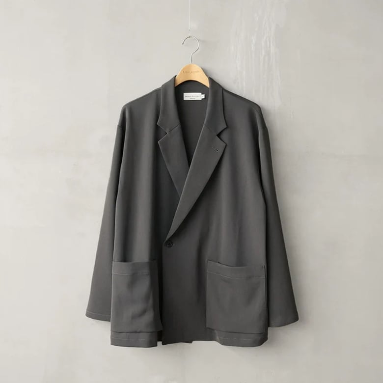ラベルと胸の開きを大きく取った抜け感のあるオーバーサイズのシルエットに、1つ掛けボタンのダブル仕様の前立てのディティールが特徴的な生地感と相まってほどよく大人っぽさを添えています。