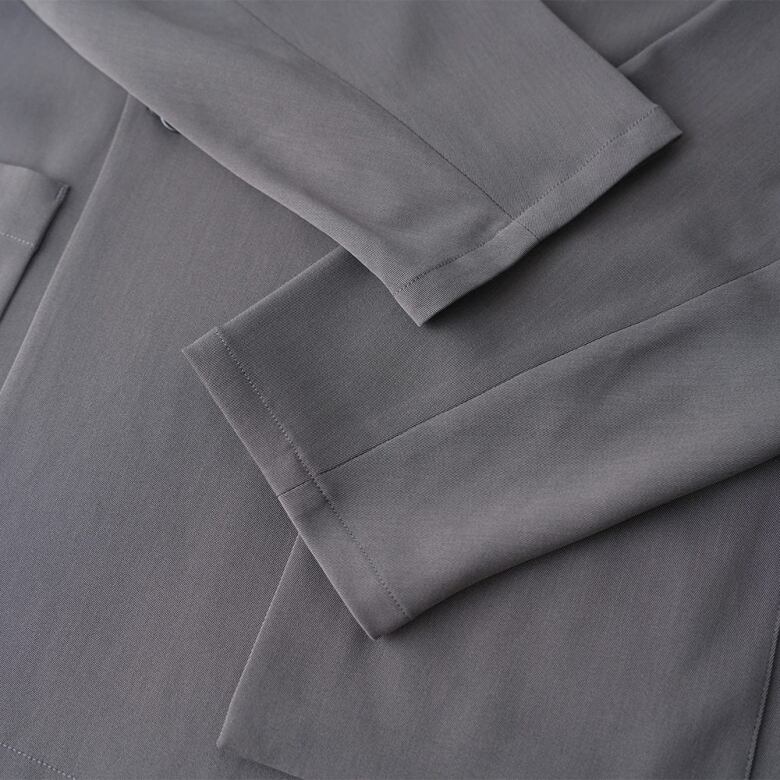 シックアンドシンといわれる太さの異なる糸を使うことにより生まれるムラのある表情感と、軽量かつ接触冷感性のある着心地のよいドライタッチのポリエステルツイルを使用。