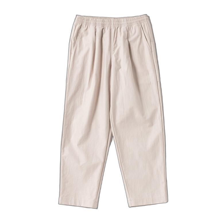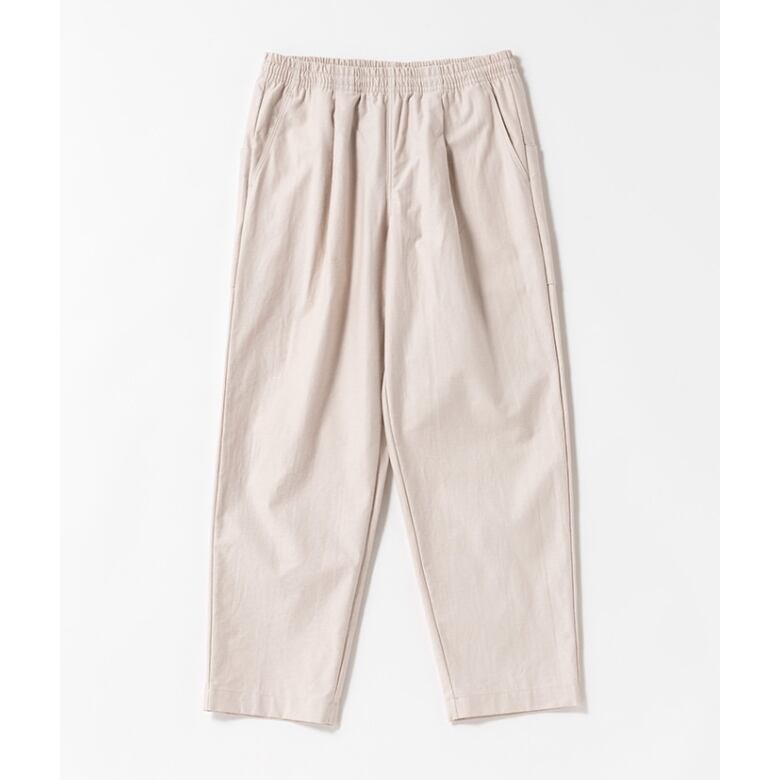 腰回りはゆったりとしながらも裾にかけて強めのテーパーですっきり見える設計です。ウエストはゴムとコードで調節が可能です。