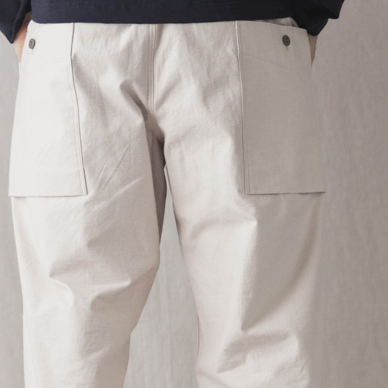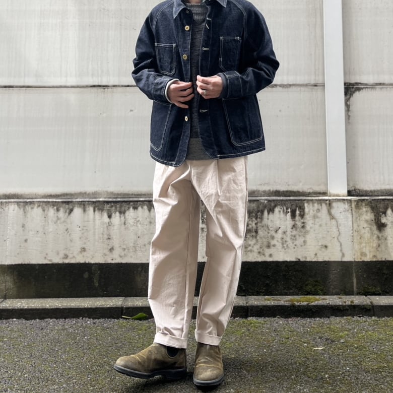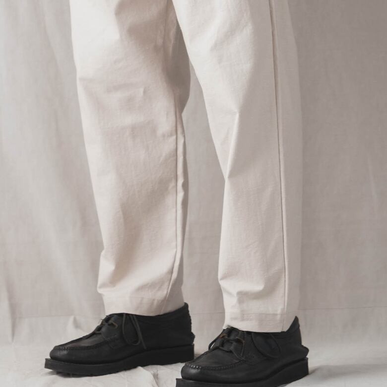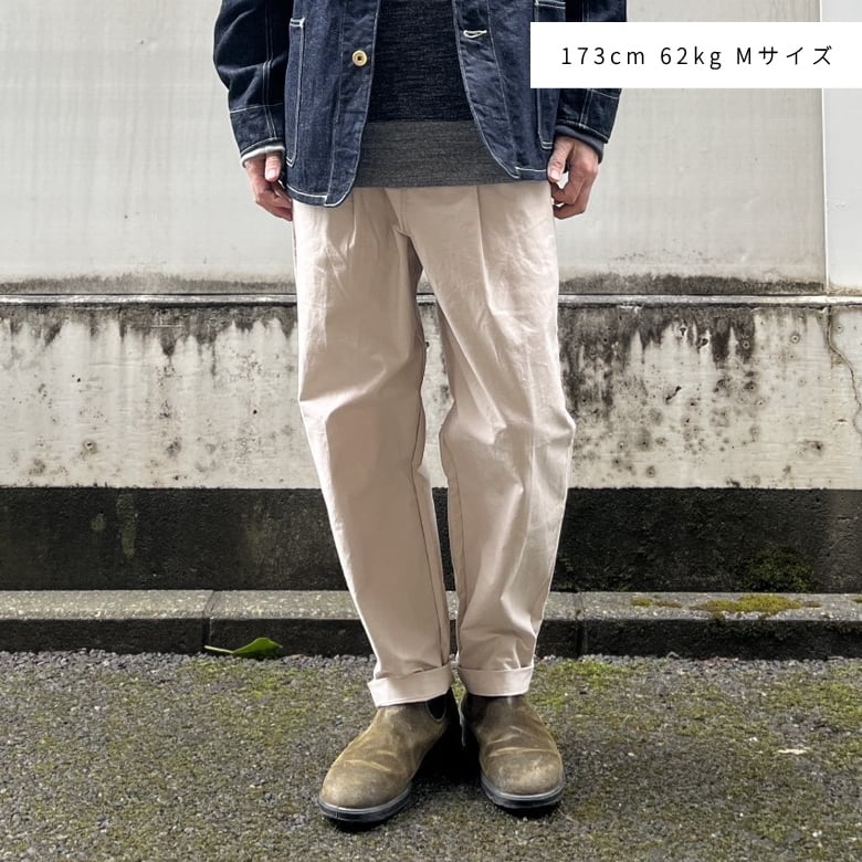 乾燥感のあるアメリカ、オーストラリアの混合綿を使用、その原綿をカーディングする際、機械の調整でネップを作り、レピア織機で糸に強度を加えながら織ることで生地自体の強度を高めたバックネップ素材を使用したBNアンプスパンツです。