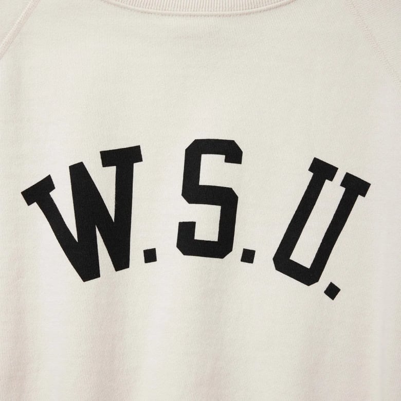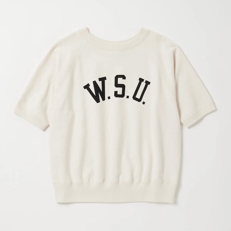 1950年代半ばに販売開始されて多くの学生たちに支持された、コットン100%の裏起毛素材によるラグランスタイルのスウェットシャツ「CRSS」。その流れを汲んで後年発売されたハーフスリーブタイプを復刻した、ハーフスリーブクルーネックスウェットシャツです。当時の生地を忠実に再現したほか、丸胴仕様やフラットシームなどの特徴的なディテールも踏襲しました。旧式のシンカー編み機で編み立てた独特のボリューム感と風合いが特長。左袖にCロゴワッペンが付いていない点も当時の仕様そのままです。プリントデザインも当時のものを復刻しています。