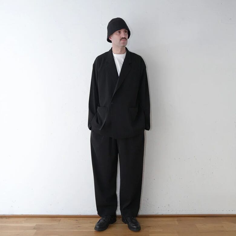シックアンドシンといわれる太さの異なる糸を使うことにより生まれるムラのある表情感と、超強撚ならではのドライタッチな素材感から生まれる着心地がよいポリエステルツイルを使用。