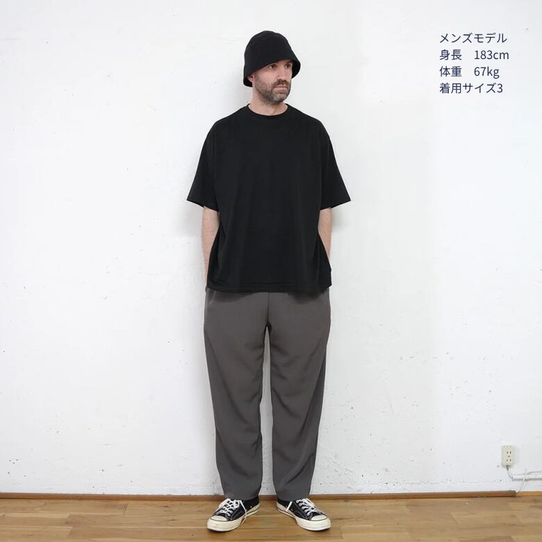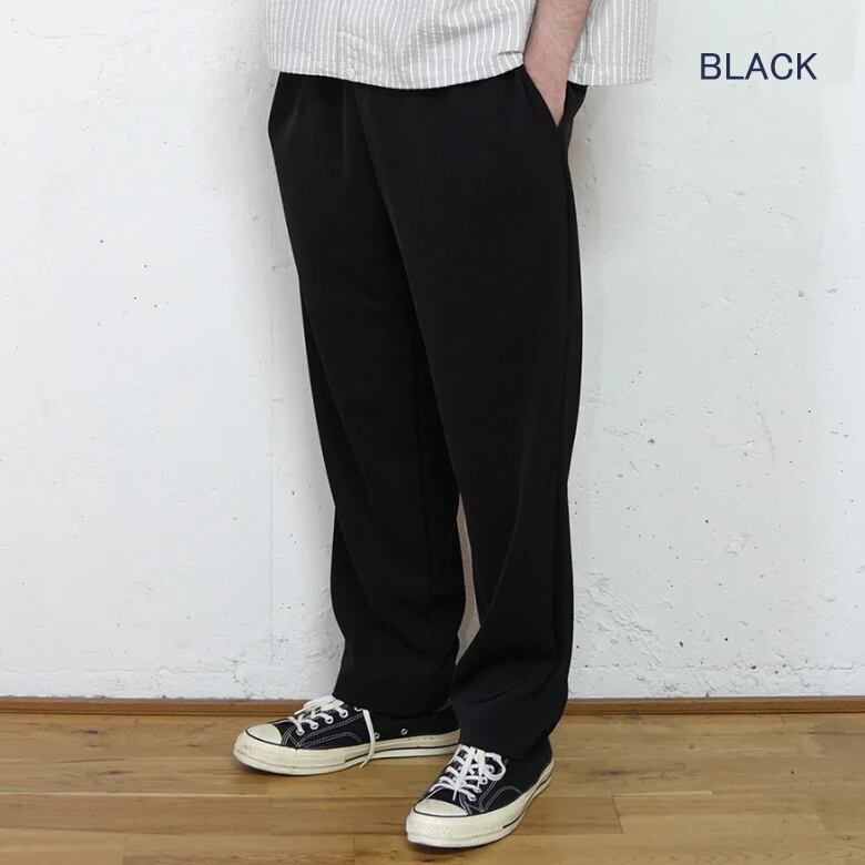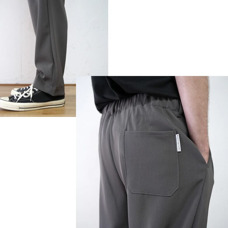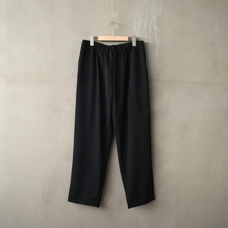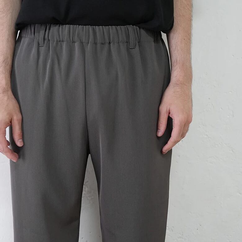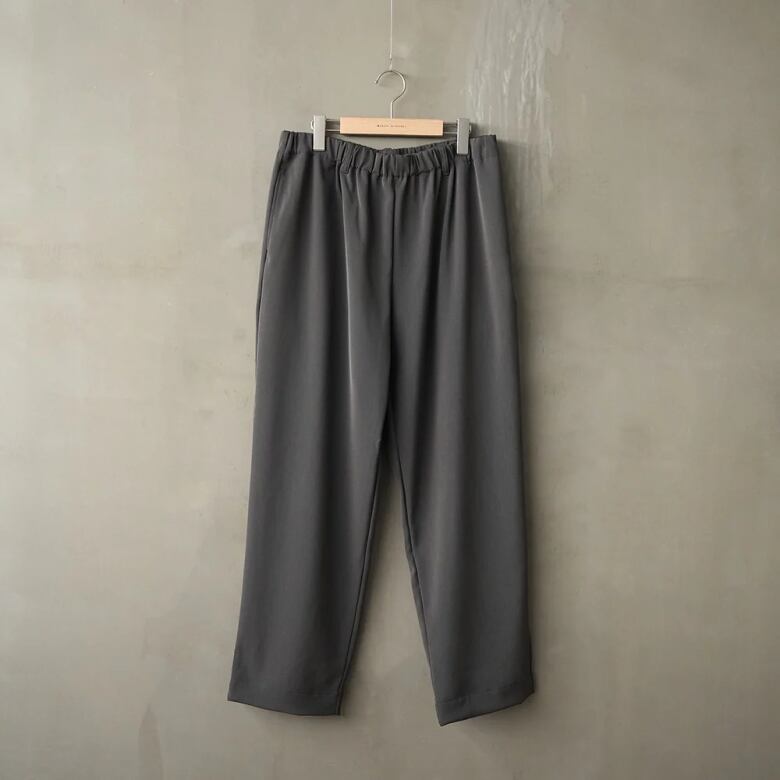 ■説明:ポリエステルの強撚糸ならではの接触冷感性と軽い生地感が特徴のツイルイージーテーパードパンツ。
