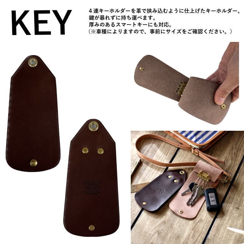 4連キーホルダーを革で挟み込むように仕上げたキーホルダー。鍵が暴れずに持ち運べます。